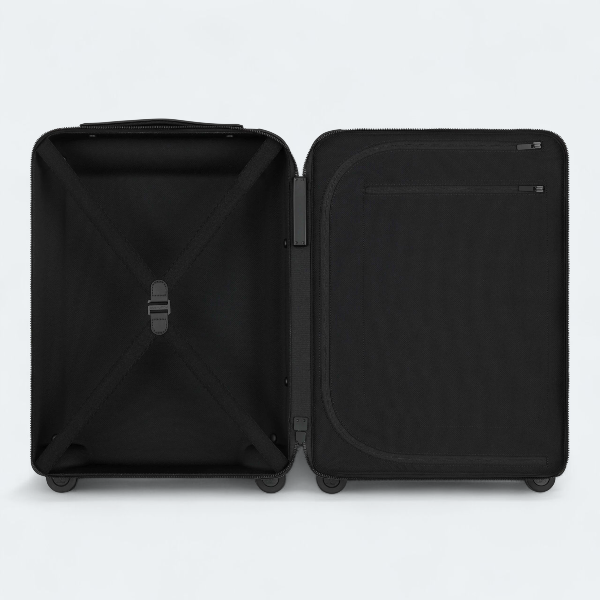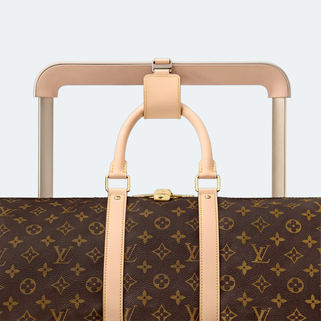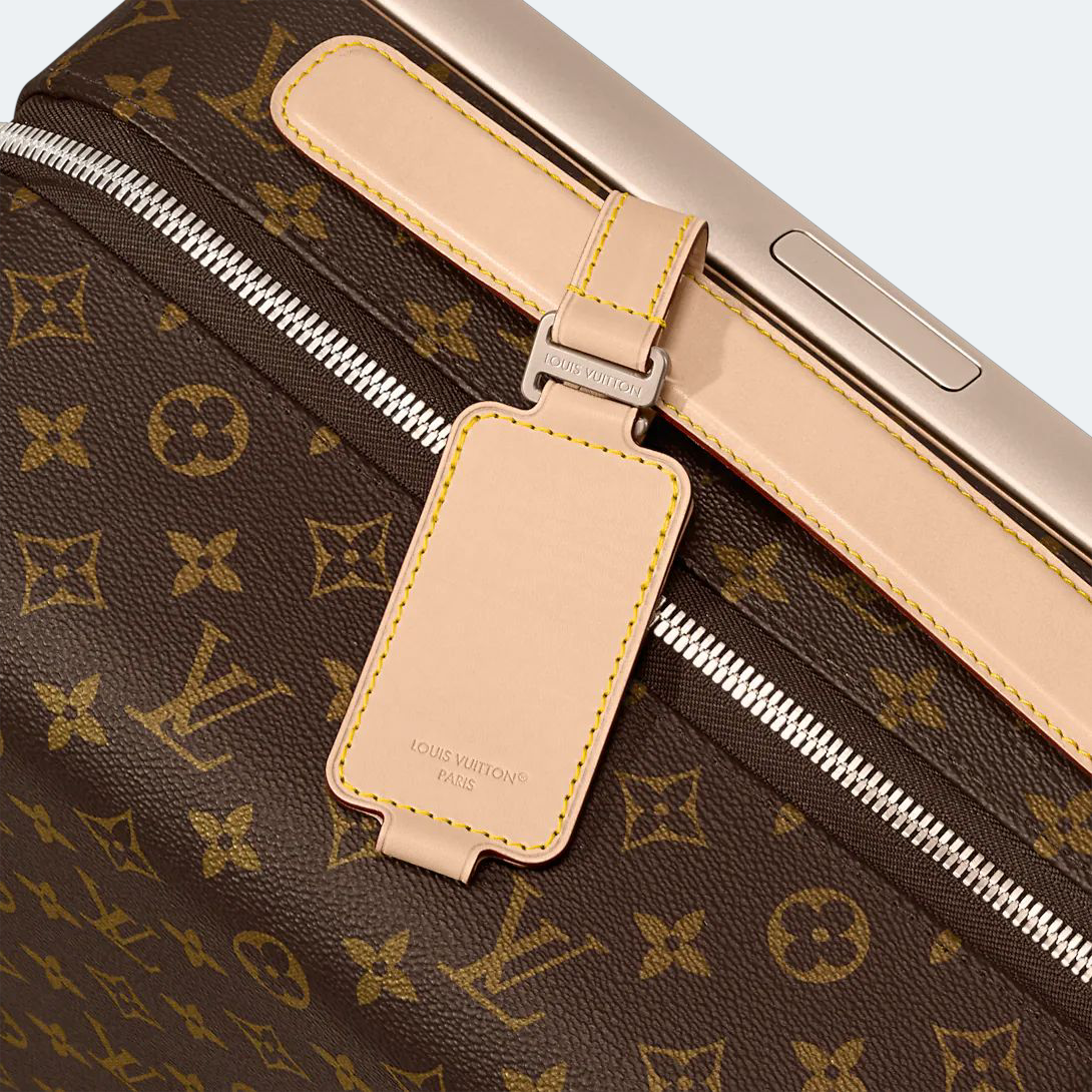The Horizon 50 rolling case is made from Monogram Eclipse canvas, featuring reinforced corners and handles in colored leather. This cabin-sized case is surprisingly spacious thanks to its unique design, which places the cane on the outside. The wide cane handle and compact wheels make the Horizon exceptionally comfortable to use.